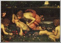 chance to beat her in the race. But Aphrodite wasn't all lovey-dovey. She could be harsh to those who defied her. Because the Lemnian women did not honor her, she inflicted a foul smell on them and caused their husbands to consort with Thracian women. The Lemnian women, abandoned by their husbands, killed all the men on the island and established a society of women. When Aphrodite caught her lover Ares in bed with Eos (Dawn), she cursed his lover with a constant longing for young mortals. When the Sirens refused to yield their virginity to either mortals or gods, Aphrodite turned them into birds. Her power was immense, and her victims included many very famous women in mythology, including Helen, Medea, Ariadne, Phaedra and Hippodameia, to name but a few. It's been written that Aphrodite's son was Eros (Love, Cupid), a very wicked and mischievous boy some say, lacking all manners. The brat spent his time in running all night from building to building, and with his love arrows breaking up respectable homes. Nobody was immune to his capricious nature, not even Zeus, in whom Eros often inspired sexual desires. Her attendants were the Horae (Hours, Seasons, who are worshipped as the wardens of the sky and of Olympus and are also said to attend to the Sun god, Helios) and the Three Graces (Aglaia, Euphrosyne and Thalia, known in Greek as the Charites); Flora and Zephyrus were ready to do her bidding as well. She was the patroness of gardens and gardeners as well as lovers. The myrtle was her tree; the rose, lily, hyacinth, crocus and narcissus were also sacred to her. Her animals were the swan, the dove, the sparrow and the dolphin. The principal places of her worship in Greece were the islands of Cythera and Cyprus, but she was revered just about everywhere. The presence of sanctuaries dedicated to Aphrodite on many islands suggests that she was a West Asian goddess who was brought to Greece by sea-traders. Aphrodite appears to have been originally identical with Astarte, the Phoenician goddess of fertility and reproduction, whom the Hebrews called Ashtoreth. The Romans called her Venus.